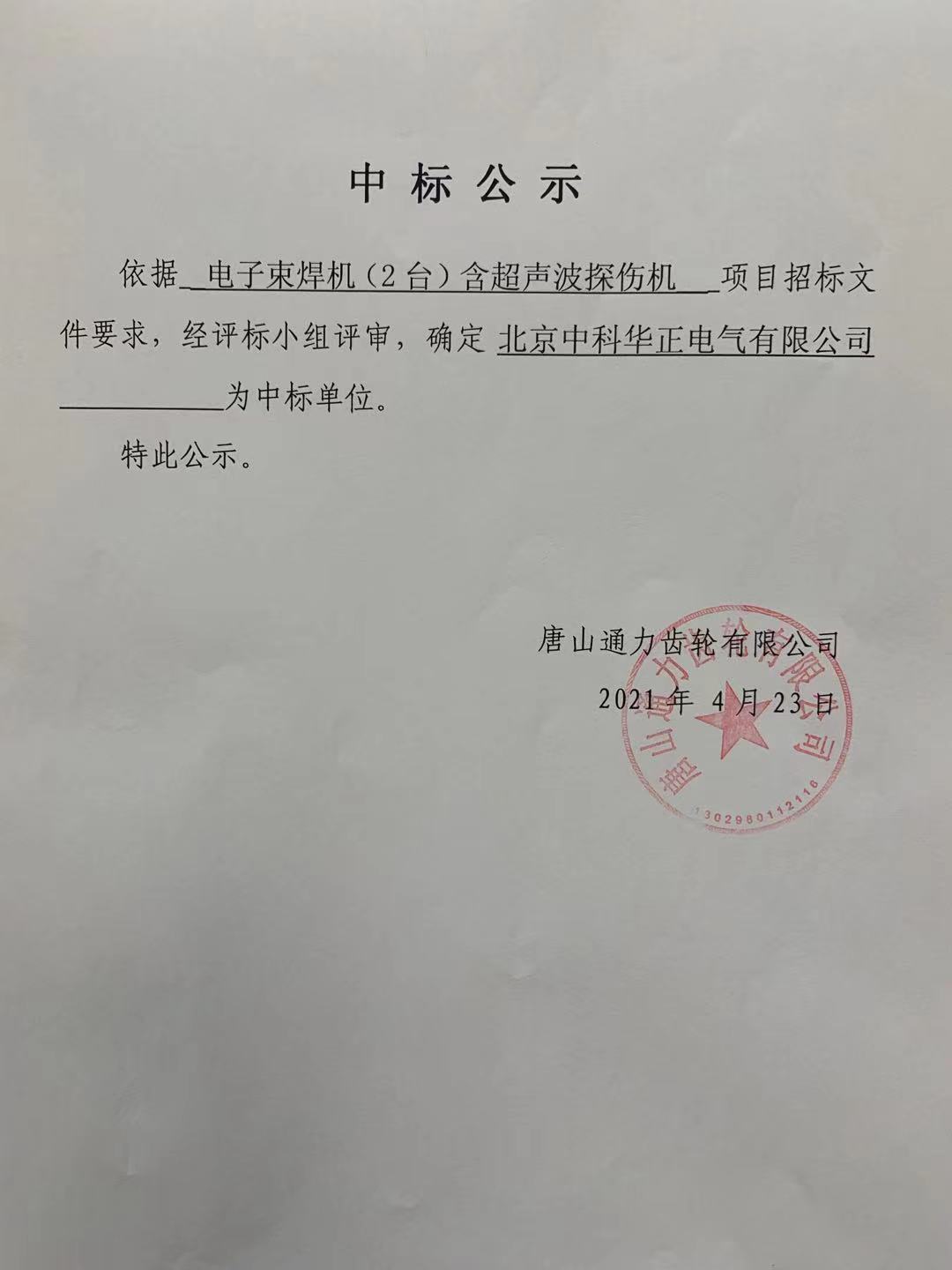 【概要描述】唐山通力齿轮有限公司电子束焊机(2台)含超声波探伤机设备采购中标公告